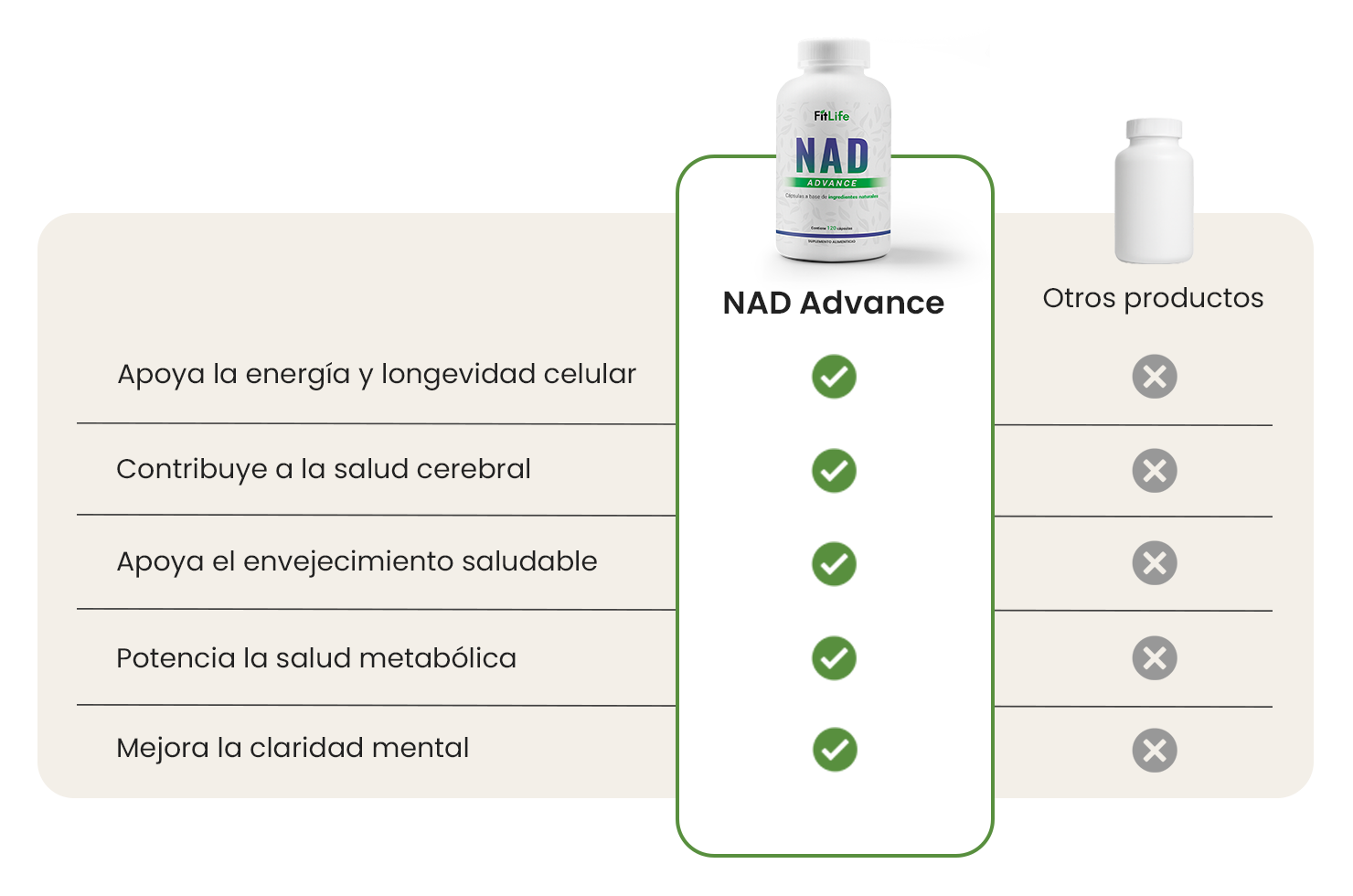 ¿Te falta energía incluso después de descansar? NAD Advance está diseñado para revitalizar desde el interior, apoyando la producción de energía celular y la reparación del ADN. Una fórmula premium que combate el cansancio y protege contra el envejecimiento prematuro.