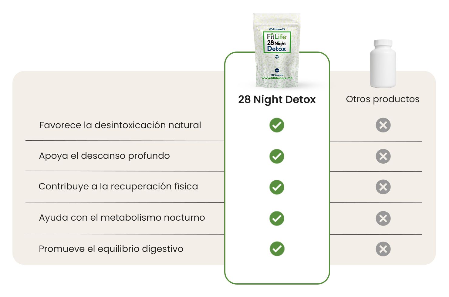 Tu cuerpo también necesita apoyo mientras descansas. 28 Night Detox está formulado para trabajar durante la noche, ayudando a mejorar la digestión, eliminar toxinas y favorecer un descanso profundo. Te despertarás más ligera y con energía renovada.