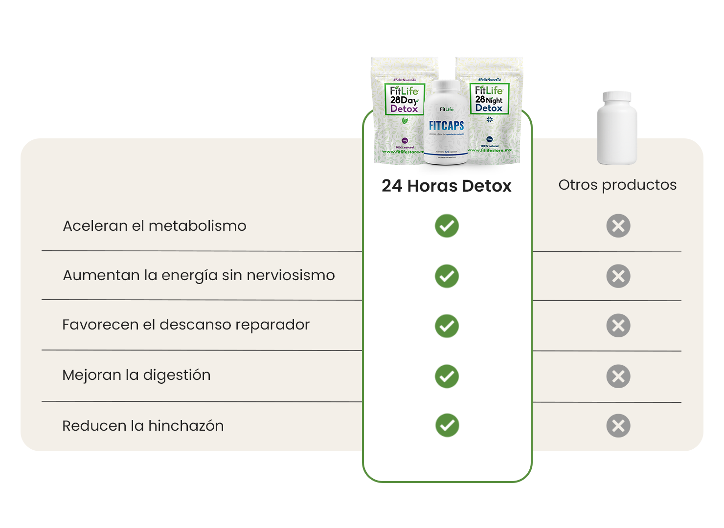 El plan perfecto para limpiar, activar y transformar tu cuerpo en 360°. Con Day Detox eliminas toxinas y recuperas energía durante el día, con Night Detox apoyas la depuración mientras duermes, y con FitCaps aceleras el metabolismo y la quema de grasa.
