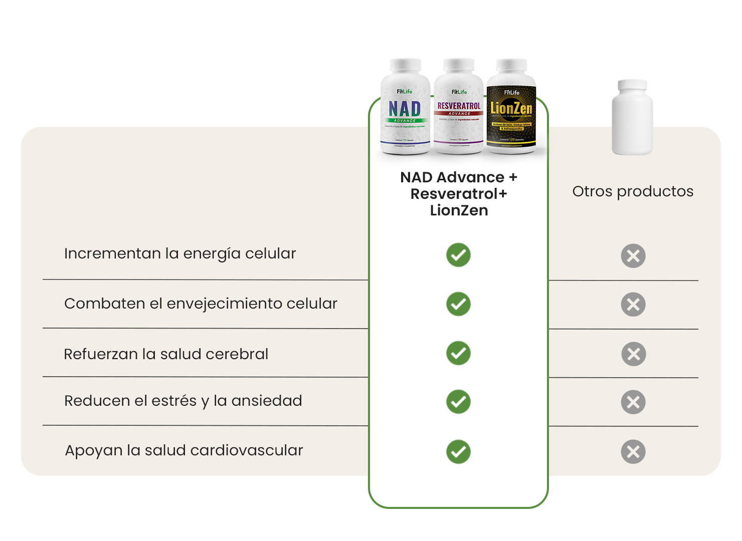 Un combo premium para energía, protección y calma. Mientras NAD Advance revitaliza las células y combate el cansancio, Resveratrol Advance protege contra el envejecimiento celular y LionZen aporta claridad mental y control del estrés.