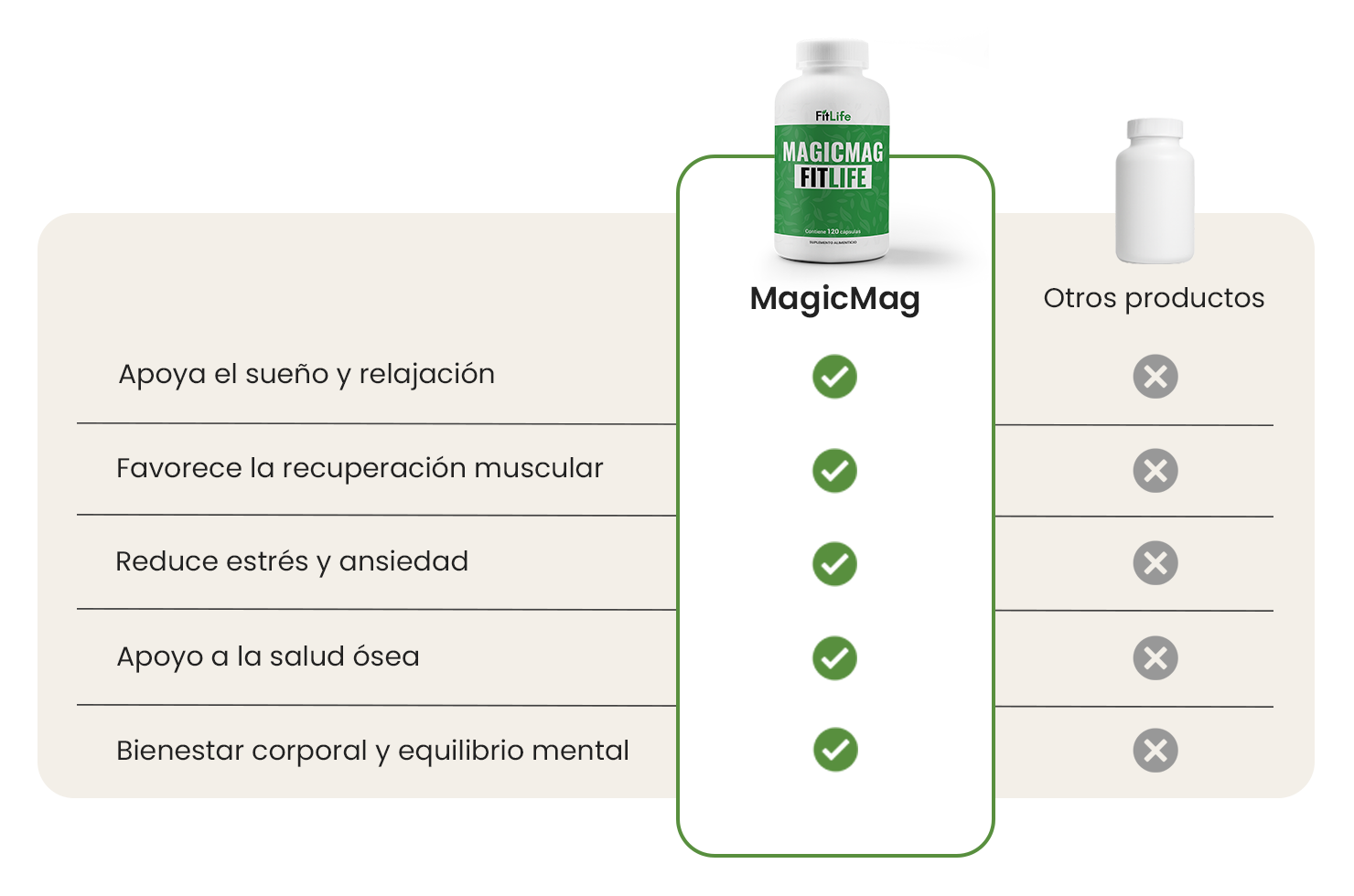 El estrés y la tensión afectan tu descanso y energía. MagicMag combina tres tipos de magnesio de alta absorción para relajar músculos y mente, mejorar tu sueño y reducir la fatiga. Una fórmula esencial para equilibrar cuerpo y mente.